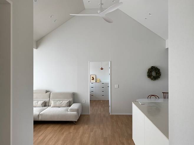먼저 거실을 보여드릴게요. 실링팬은 루씨에어 제품이에요. 천장고가 약 4m정도 되고 박공지붕이어서 연장봉을 결합하여 설치했습니다. 요즘은 리버스 기능을 주로 사용하는데 바람은 많이 느껴지지 않고 공기는 순환되어서 좋더라구요. 특히 소음이 거의 없어서 아주 만족스러워요.