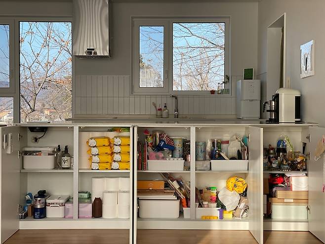 요즘 리모델링할 때 대면형 주방을 많이 하시더라구요. 이 집은 주방 후드 위치 때문에 대면형 주방을 할 수밖에 없었어요. 물론 탄소필터 후드를 선택하면 ㄱ자형 주방도 할 수 있다 하셨는데, 비싼 탄소필터를 주기적으로 교체하고 관리해야 하는 번거로움이 있고 무엇보다 성능으로는 무조건 덕트 있는 일반 후드가 낫다고 합니다. 그리고 상부장이 없고 싱크대와 인덕션이 있는 곳은 공간이 여유롭지 않아서 조리 공간과 수납 확보를 위해 길이 2570 폭 900의 아일랜드 장을 제작했습니다.