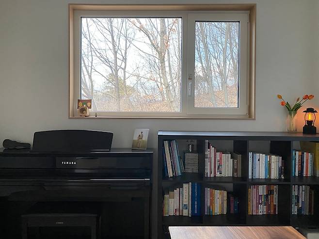 서재를 소개할게요. 숲 조망인 이 방은 뷰는 참 좋은데 북동향이라 해가 안 들어요. 그래서 아이 놀이방 대신 서재로 정했어요. 지금은 나뭇잎이 다 떨어져서 좀 황량한 분위기이지만 곧 봄이 오면 참 예쁠 거예요.