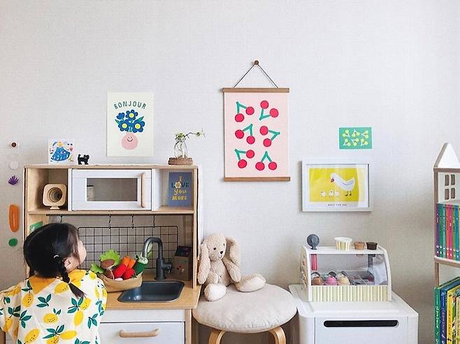 방문 옆 벽, 시선이 바로 가지 않는 사각지대에는 엄마 갬성과는 쬐끔 멀지만 아이가 정말 좋아하는 주방놀이와 수납함들을 놓았어요. 장난감을 종류별로 수납함에 정리하면 아이가 스스로 원하는 장난감을 찾아서 놀아요. 다 놀고 난 후엔 제자리에 정리도 잘하구요. 근데 이렇게 사진을 보니 왼쪽 수납함도 같은 걸로 사서 대칭을 맞춰야겠다는 생각이... 이쯤 되면 병이네요.