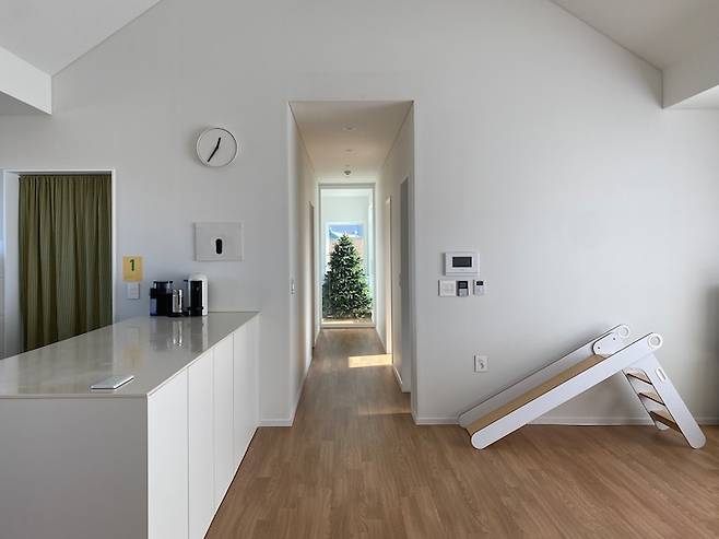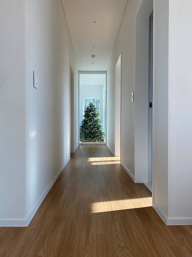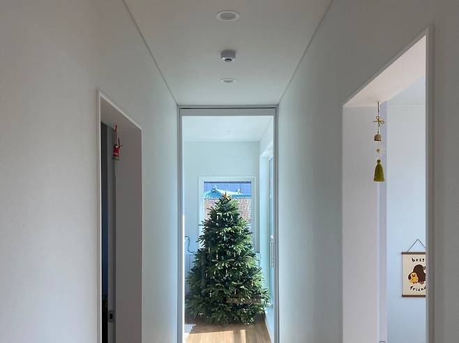 저희 집만 트리를 아직 못 정리한 건가요? 트리는 원래 3월쯤 정리하는 것 맞죠? ㅎㅎ 트리를 정리하면 예쁜 식물이 심어진 화분을 놓아볼까 해요. 저희 집이 햇살 맛집인데 이 자리가 광합성 하기 제일 좋은 명당이거든요. 트리에 오너먼트를 따로 안 하고 있다가 아이랑 비즈로 만들어본 게 생각보다 예뻐서 쭈욱 달아놓고 있어요. 트리 바로 맞은편은 복도예요. 복도가 시작되는 곳에 중문을 시공했습니다.