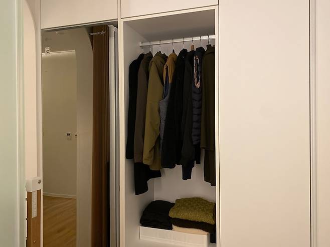 드레스룸 옷장을 제작할 때 스타일러 돌린 옷을 걸어둘 공간을 만들었어요. 아무리 스타일러를 돌렸어도 입었던 옷을 옷장에 넣기는 찝찝한데 이 공간이 있으니 아주 편리합니다.