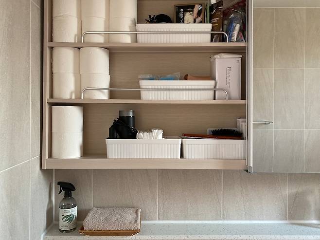물을 자주 사용하는 공간이다 보니 깨끗하게 사용하면서 청결하게 유지하려고 노력합니다. 화장실 시공할 때 거울장 없이 예쁜 거울 하나만 깔끔하게 달아놓을까도 고민했었는데, 수납장 없었으면 난감할 뻔했어요. 이 많은 짐들을... 물건들 눈에 안 보여야 안정감 드는 사람 나야 나.