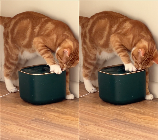 방 한구석에 놓인 자동 급수기를 보고, 물을 먹기 전에 탐색부터 하는 치즈냥이 입니다. 옆면을 벅벅 긁고, 물이 나오는 윗면을 확 잡아당기더니 정체 파악이 안 되었는지 급수기 주변을 살피는 고양이.