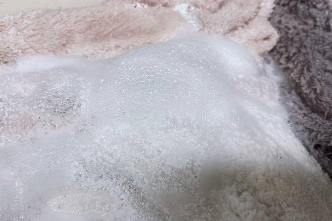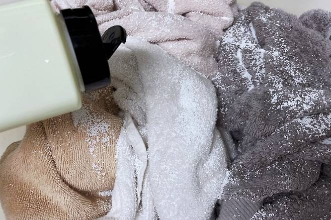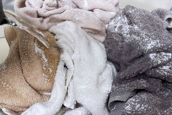 일단 대야에 수건을 담고 그 위에 과탄산소다를 골고루 뿌려주세요. 수건이 서로 겹쳐 있다면 속 수건까지 과탄산소다가 뿌려지게 해 주세요.