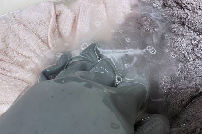 수건을 뒤적뒤적해주면서 서로 잘 섞이게 해 주고 이대로 5-10분 그대로 두세요. 뜨거운 물이 식었다 싶으면 세탁기에 대야채로 부어 주세요.