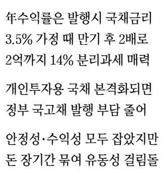 개인투자용 국채는 정부가 서민 장기투자 촉진을 목적으로 야심 차게 처음 선보이는 상품인 만큼 금리나 세제 혜택 면에서는 투자 매력이 있다. 나라가 부도나지 않는 이상 원리금이 보장되는 국채가 투자 대상인 만큼 안정성은 최고 수준이다. 문제는 유동성이다. 세제 혜택이나 가산금리 혜택을 보려면 최소 10년에서 20년까지 돈이 묶인다. 김형호 한국채권투자운용 대표는 "개인투자용 국채는 정책 지원이 결합돼 안정성과 수익성을 갖춘 상품이지만 투자자 입장에서 유동성이 제한되는 점이 큰 제약 조건"이라며 "급전이 필요한 투자자가 개인투자용 국채를 담보로 대출받을 수 있도록 제도를 설계한다면 보완이 될 수 있다"고 말했다.