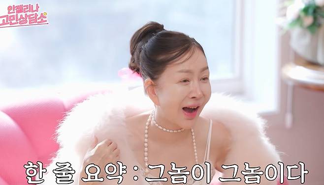 또 그는 자신의 연애관에 대해 "내 인생에서 만나는 남자는 결국 똑같은 맛, 똑같은 과일이다. 그러니까 그 눈으로 보는 남자가 똑같지 뭐가 다르겠느냐. 내가 바뀌어야 한다. 내가 사람 보는 안목이 바뀌어야 한다"며 조언을 더했다.