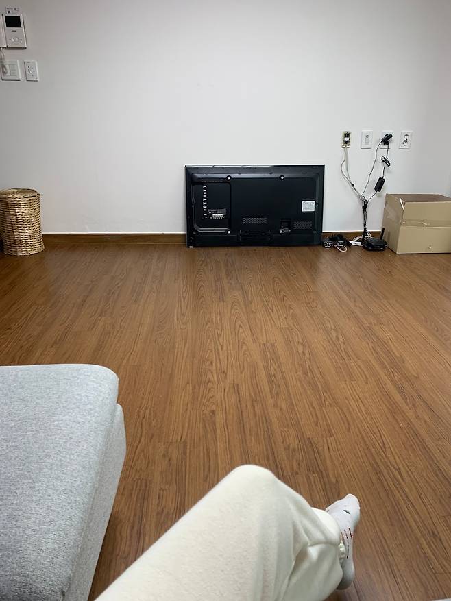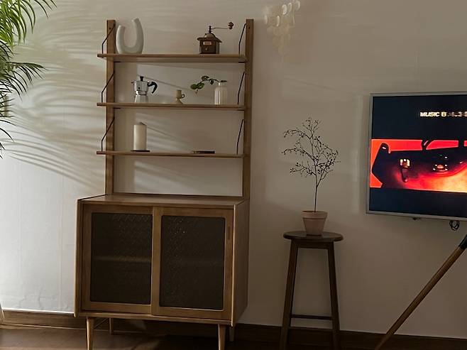TV는 벽걸이를 할까 티비장 위에 둘까 고민을 많이 했는데 콘센트 자체가 거실 오른쪽에 있기도 해서 티비 거치대를 구매하였어요. 그래서 액자 느낌으로 구석에 배치하였고 조금 더 넓어 보이는 것 같아요. 티비 거치대도 바닥색과 비슷한 우드 톤으로 구매해서 톤을 맞추어 보았어요.