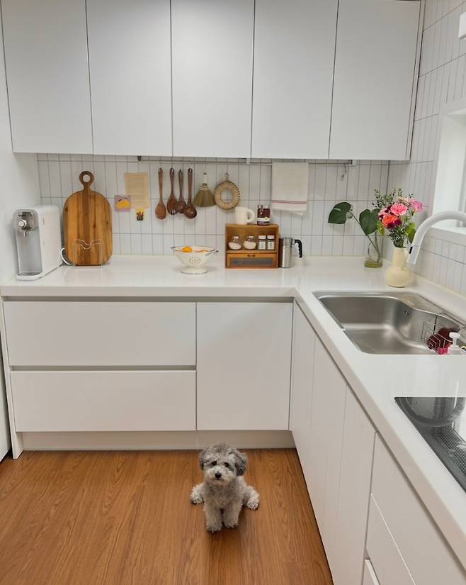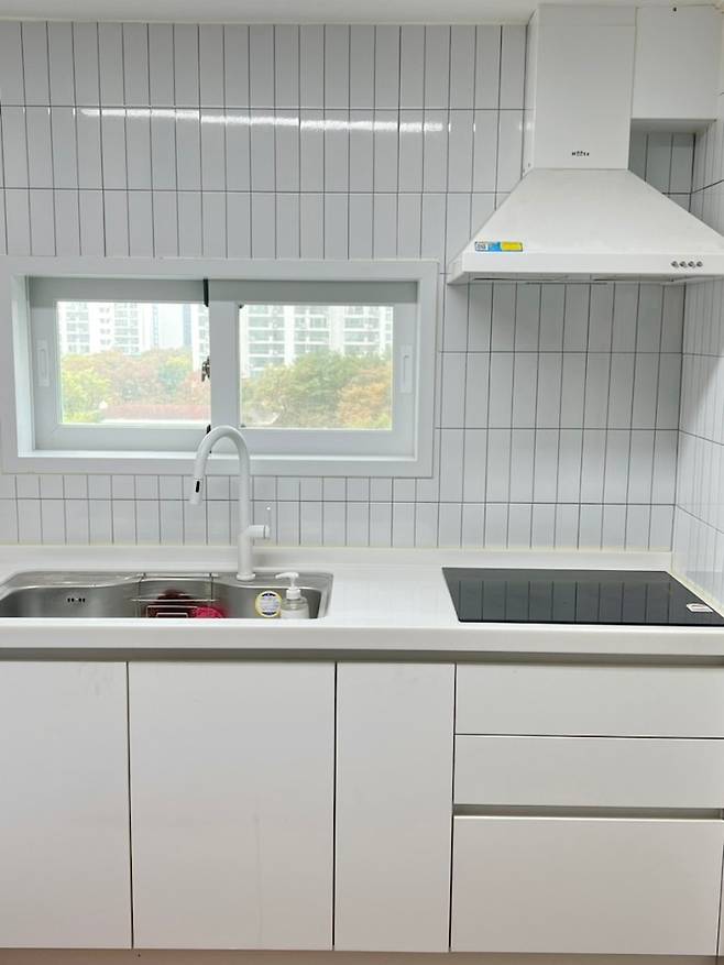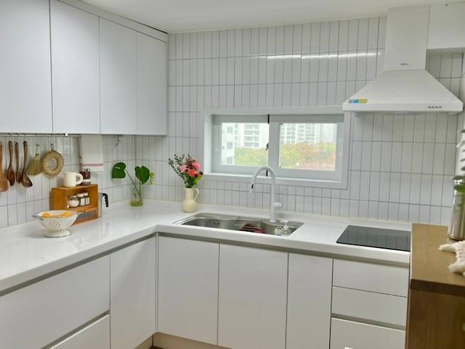 화이트 부엌에 대한 로망이 있었기 때문에 수전부터 후드, 타일까지 모두 화이트로 깔맞춤했어요.