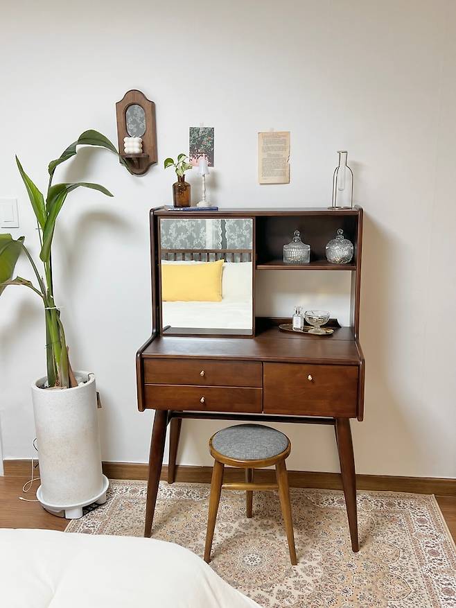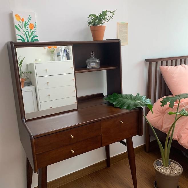 화장대는 제가 저희 집 가구 중 가장 좋아하는 가구에요. 꼭 이런 어두운 느낌의 원목으로 사고 싶었는데 제 마음에 쏙 드는 걸 발견했어요. 화장대는 아직까지도 애지중지 하며 매일 닦고 있답니다. 아무것도 없이 깔끔하게 두기도 하고 가끔은 오브제나 화병을 둬서 침실 분위기 전환도 하구요.