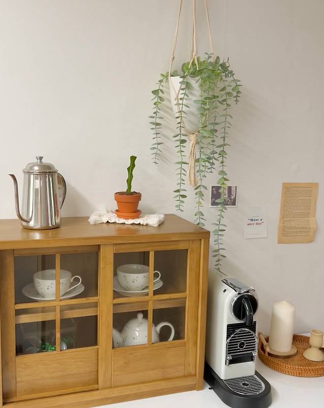 선반 위에 홈 카페 공간으로 만들고 싶어서 커피 머신과 우드장을 뒀는데요. 에어 프라이어와 밥솥이 보이는 게 영 마음에 들지 않더라구요. 그래서 천을 구매해서 다이소에서 커튼봉을 사서 직접 바느질을 해서 이렇게 가리개를 만들어주었더니 훨씬 깔끔해졌어요.