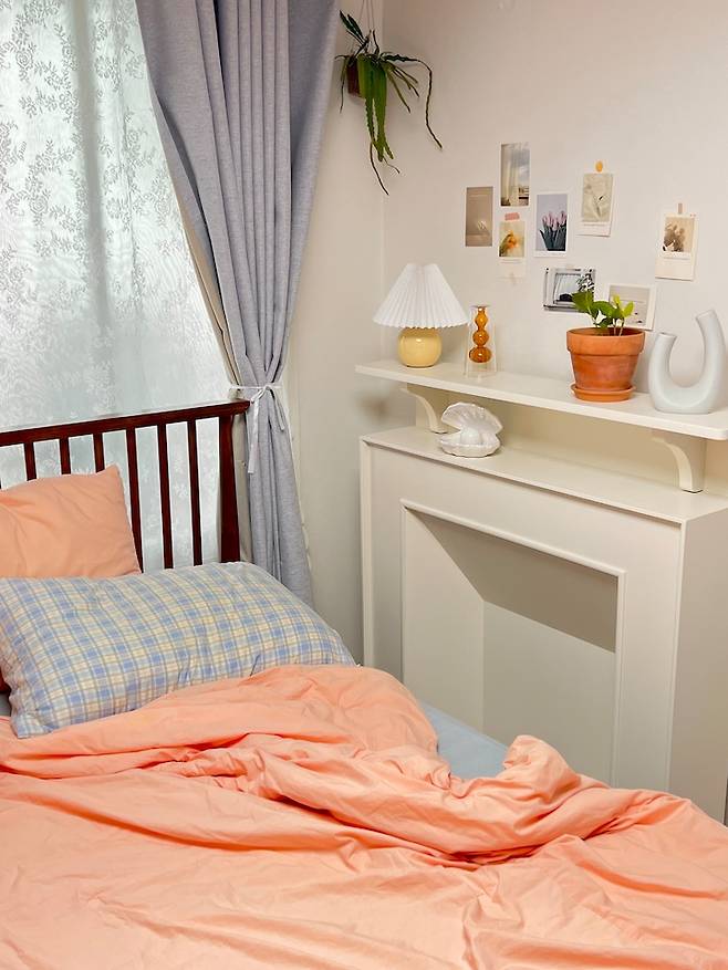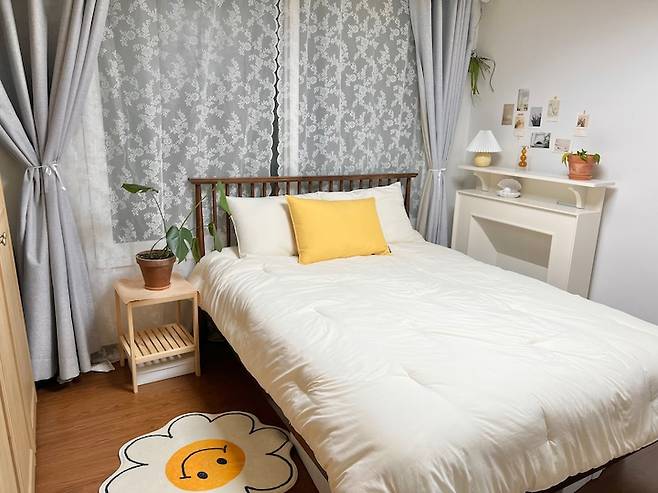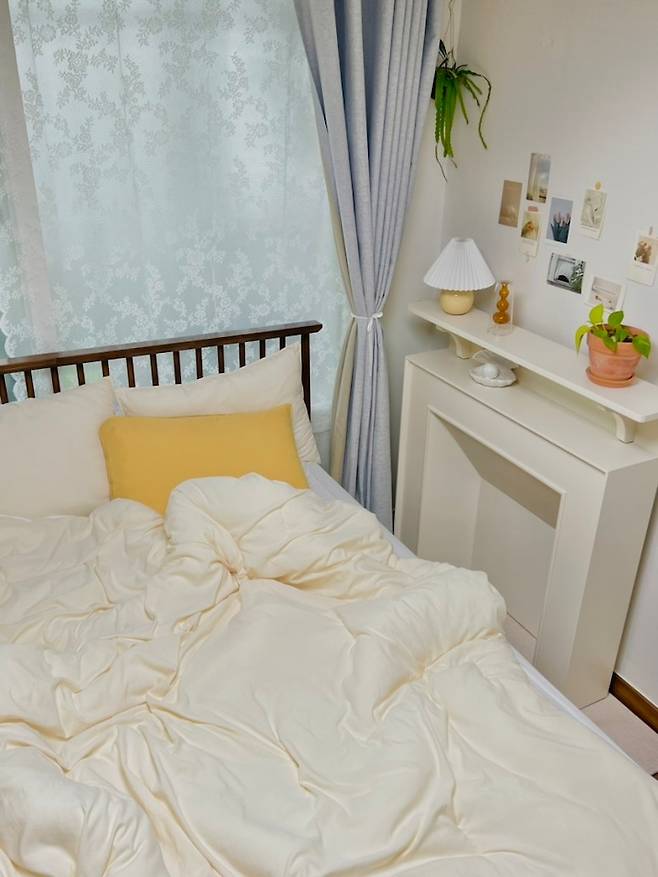 저희는 방 배치를 자주 바꾸는 편이에요. 처음에 침실은 아늑하고 작은 공간에 두고 싶어서 작은 방에다 침대를 놓고 화장대를 옆에 두고 협탁 대신 식물로 플랜테리어를 계획했어요. 나름 아기자기하게 모여있는 공간이라 마음에 들었는데요. 갑자기 아기가 생겨서 나중에 아기 침대를 옆에 두기로 하고 가장 큰 안방으로 침대를 옮겼답니다.