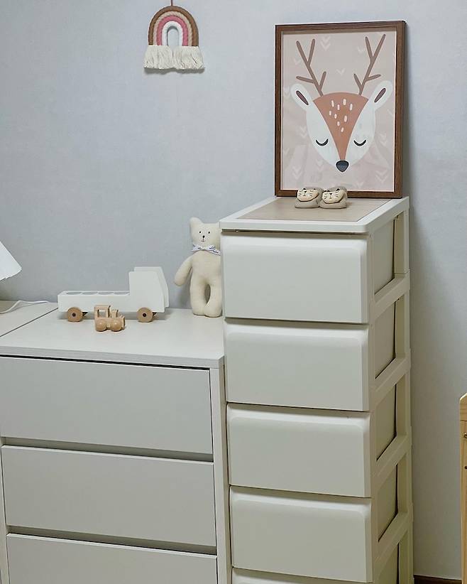 아기 옷이나 양말, 손수건 등 자질구레하게 넣을 게 많아서 서랍장을 따로 뒀어요.