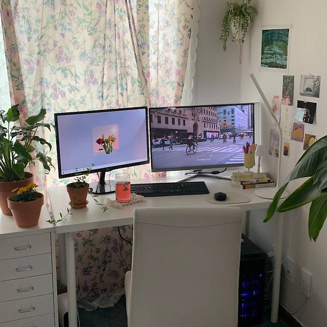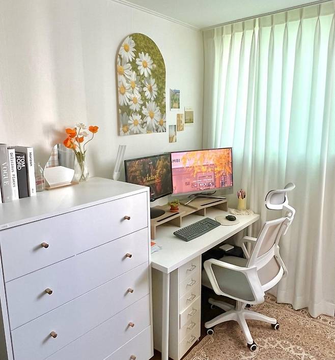 지금은 나무 대신 서랍장을 넣고 공간분리를 했는데 그전보다 더 깔끔한 느낌이 들어서 좋더라구요. 저는 종종 카펫을 바꿔서 방 분위기에 변화를 주곤 해요. 햇살이 잘 들어오는 곳이라 아침에 일을 하면 기분이 좋아져요.집에서 제가 가장 많이 있는 공간이라 애정도 가장 많이 쏟는 공간이에요