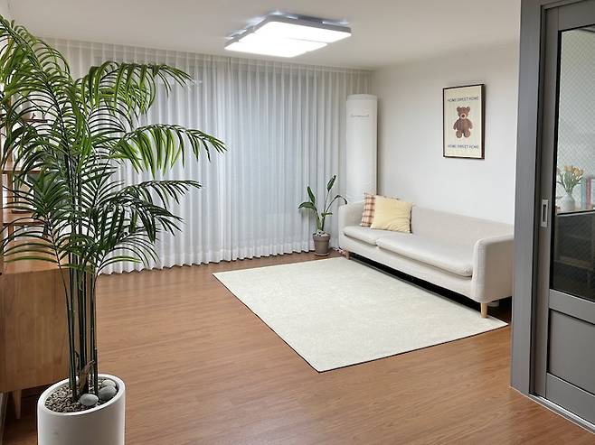 완성된 거실의 모습입니다. 중문이 회색이라 처음에 다시 시트지를 붙일까 하다가 바닥색이 어두워서 나름 어울리는 것 같아서 두고 있어요. 그런데 조만간 베이지 톤으로 시트지를 다시 붙일 거에요. 그 때 다시 한 번 소개해드릴 수 있으면 좋겠네요.