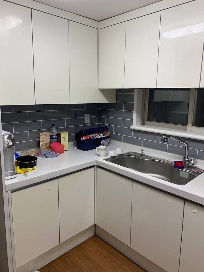 또한 상부장이 이렇게 길이가 맞지 않아서 답답해 보였구요. 그리고 창문 샷시도 오래되었고 상부장이 가리고 있어서 더 좁아보이는 느낌이 들더라구요. 싱크대 선반 역시 좁은 편이라 물건을 올려두기도 부족하고 요리할 공간도 부족해 보였어요.