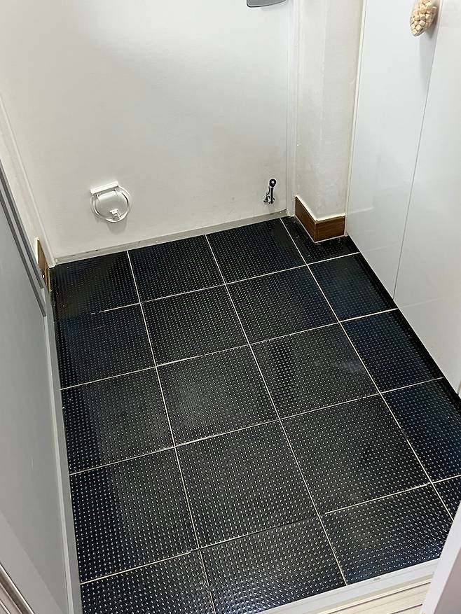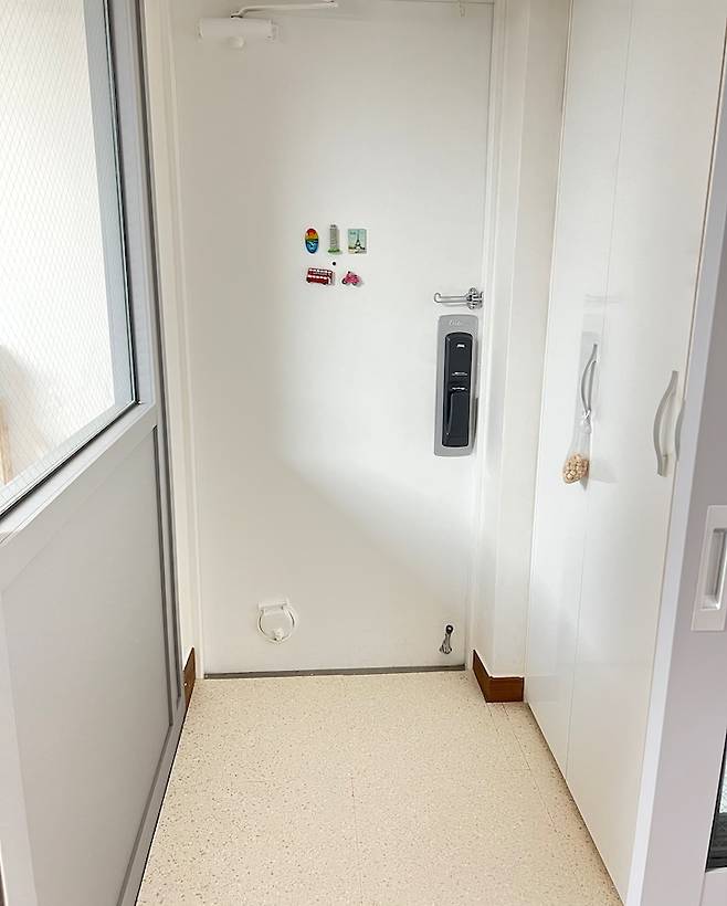 현관 타일은 셀프로 교체했어요. 요즘은 타일 시트지를 팔더라구요. 그래서 새로 칠한 현관문과 어울리게 베이지 톤의 시트지를 골랐고 제가 직접 재단해서 붙였답니다. 삐뚤 빼뚤 서툰 부분이 많지만 그래도 시트지 자르고 붙이는 동안 재미있었기 때문에 그걸로 됐다며 스스로 위안을 삼고 있어요.