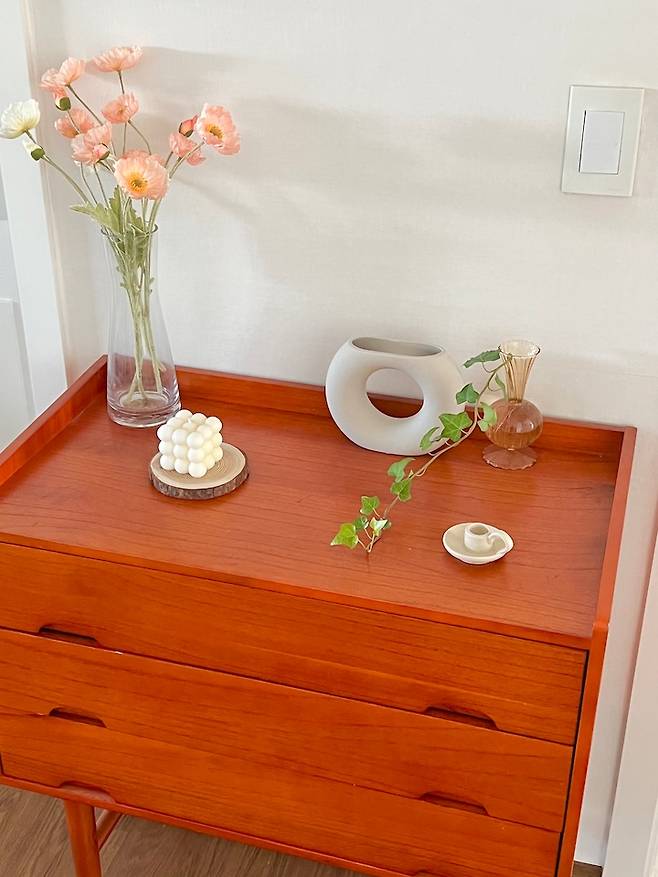 지금은 아기 때문에 벽난로 콘솔을 안방으로 들이고 장미맨숀의 우드 선반장을 들여서 위에 오브제를 때때로 바꿔주면서 분위기 전환을 해주고 있답니다. 아기가 생기면서 많은 곳이 변화가 생겼지만 나름 그 변화에 맞춰서 마음에 드는 공간으로 바꿔주기 위해 노력 중이에요.