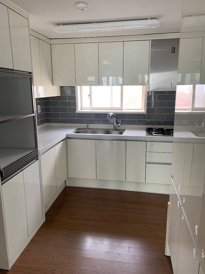 저희 아파트는 지어진 지 20년도 넘은 아파트에요. 그래서 확장형 거실인 요즘과 다르게 베란다가 있어요. 처음 들어왔을 때 부엌 싱크장도 노랗게 변색이 많이 되어서 부엌 인테리어는 꼭 하고 싶었답니다. 보일러도 오래되어서 누수가 발생한 상태라 공사를 해야 했구요.