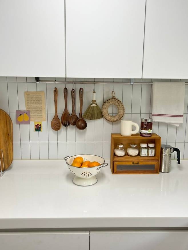 방문 손잡이도 직접 달고 부엌 조명 등도 하나하나 다 새로 달았어요. 그 전엔 조금 어두운 분위기였는데 바꾸고 나니 따뜻해 보이는 분위기로 바뀐 것 같다는 말을 많이 듣고 있어요