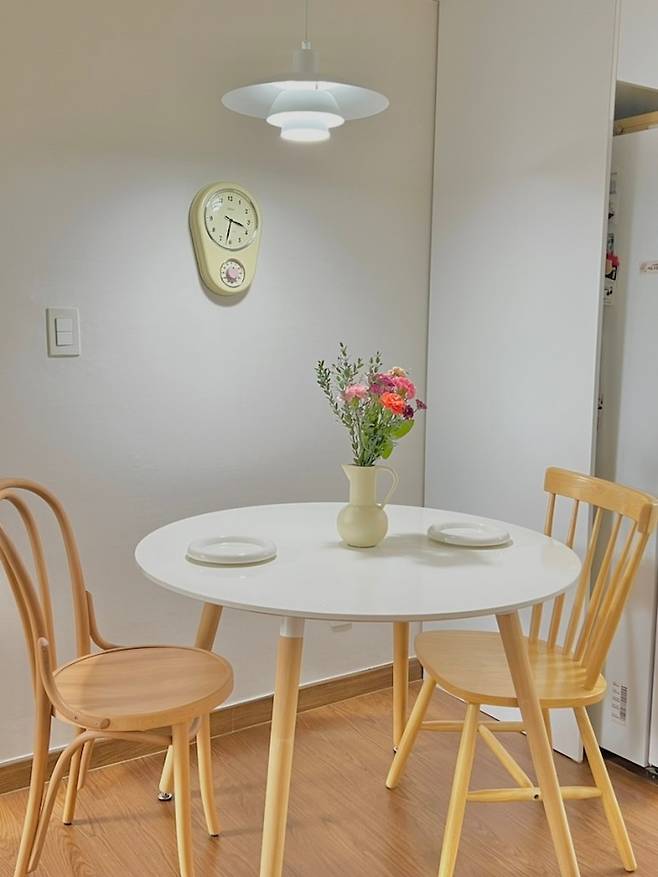 이사를 오면서 그동안 사용하던 사각 식탁을 보내버리고 공간 활용을 위한 원형 식탁으로 새로 구매했는데 여러 명이 앉기 좋아서 사람들 초대하기 좋아하는 저희 부부에게 딱이에요.