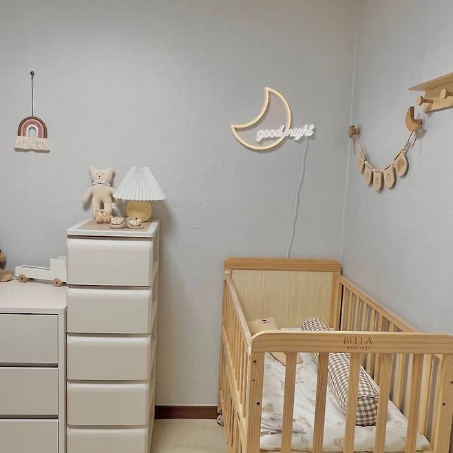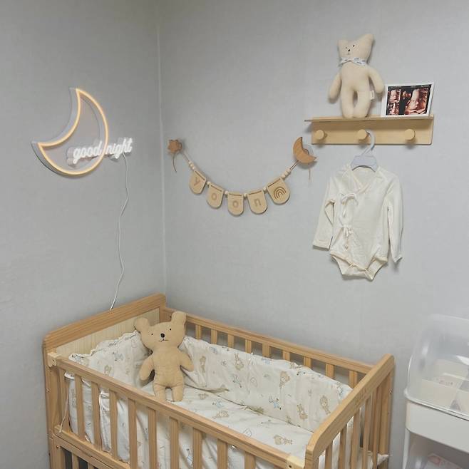그리고 아기 침대도 옆에 배치하고 바닥엔 카펫을 깔아서 따뜻한 느낌을 주고자 했어요. 이렇게 아기 초음파 사진도 하나 올려 놓구요. 지금은 아기가 커서 아기 침대는 없애버렸고 범퍼 침대를 들여야 하나 패밀리 침대를 들여야 하나 고민하고 있답니다.