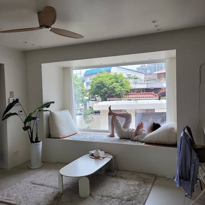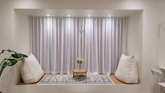 이 곳은 저희 집의 시그니처 공간인 윈도우 시트입니다. 퇴근 후에 늘어져서 에너지를 충전하거나 주말 낮에 하늘을 보며 시간을 보내는 공간입니다.