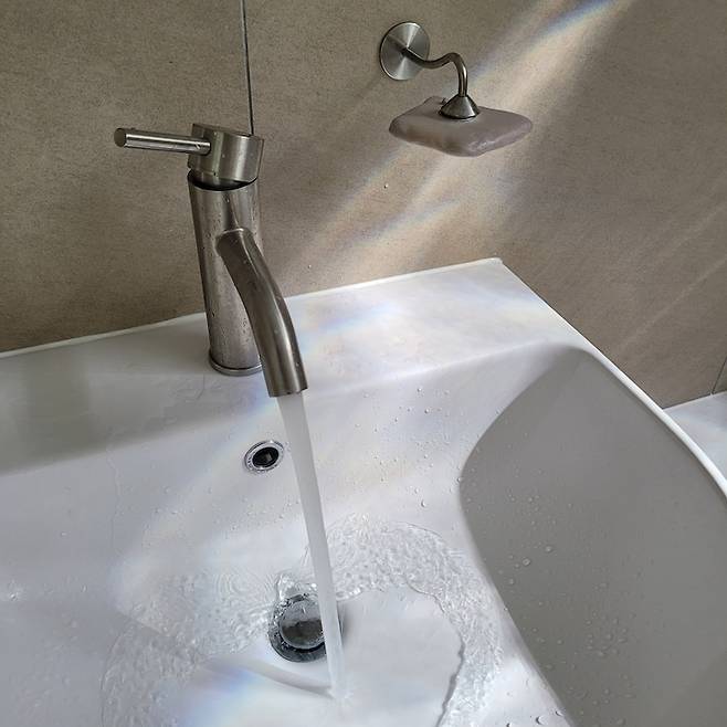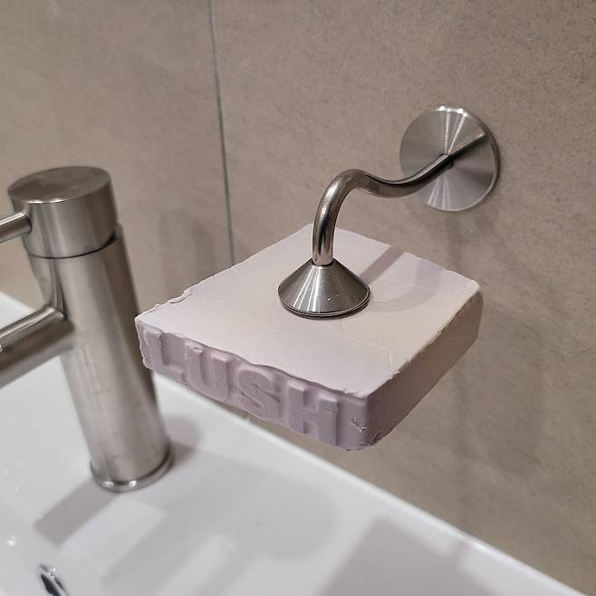 그리고 비누를 좋아하는 저에게 비누거치대는 필수였어요. 세면대 오른쪽에 수전과 같은 스테인레스 비누홀더를 설치했습니다. 자석으로 붙였다 떼었다 할 수 있고, 비누가 공중에 떠 있어서 곰팡이 등으로부터 비누를 위생적으로 관리할 수 있어요.