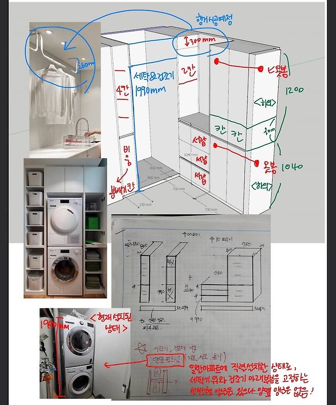 세탁실 및 팬트리 공간 디자인에 앞서, 주방가구 제작업체 사장님과 열띤 회의를 거쳤어요. 수많은 레퍼런스와 수정 과정 끝에 탄생한 공간입니다. (캡처본은 hommomgmong님의 세탁실 구조로, 큰 도움이 되었습니다.)