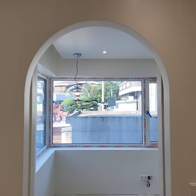 둥근 아치문을 열면 시원하게 뚫린 ㄱ자 창이 보입니다. 아치문에 이은 두번째 '우와 포인트'예요.