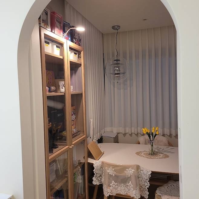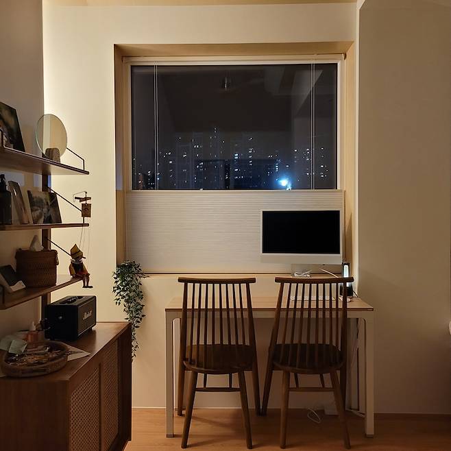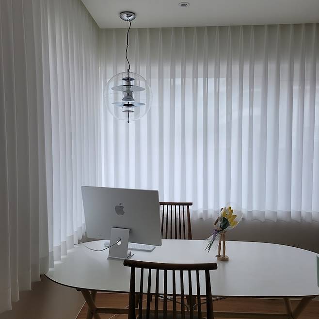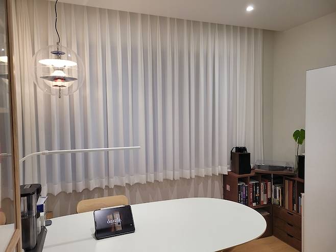 촤르르 커튼을 설치한 후 6인용 테이블에 작업용 PC까지 놓으니, 제법 작업실 같습니다. 다이닝의 흔적은 점점 사라져 갑니다.