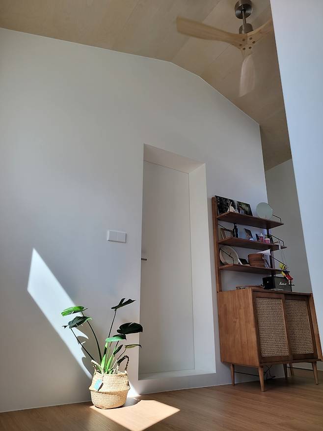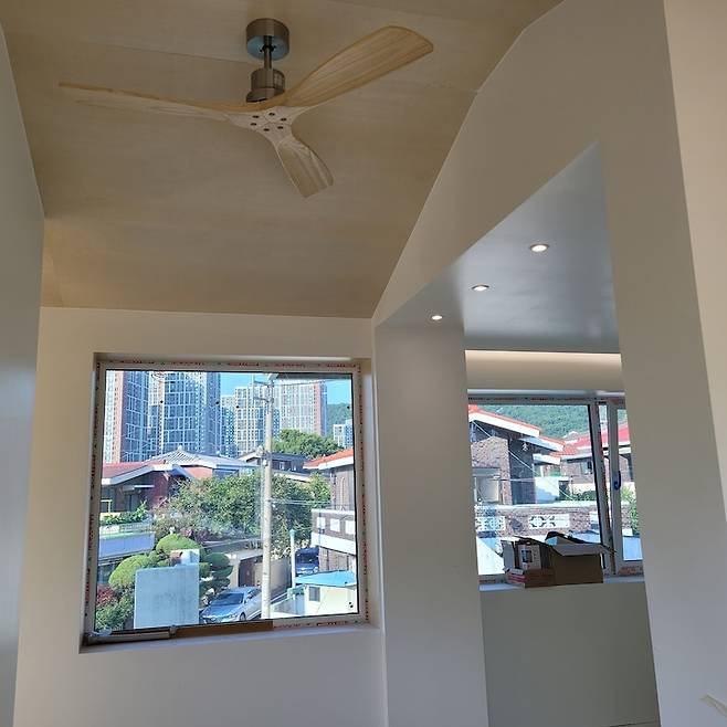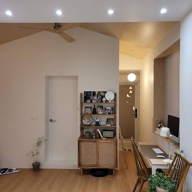 2층은 높은 층고와 박공형의 지붕모양을 그대로 살리되, 실링팬을 달 수 있도록 박공모양 가운데 평평한 공간을 만들어 천장모양을 새롭게 디자인하였어요. 1층은 루씨에어사의 실링팬이었지만 2층은 스피아노사의 실링팬을 달았습니다.