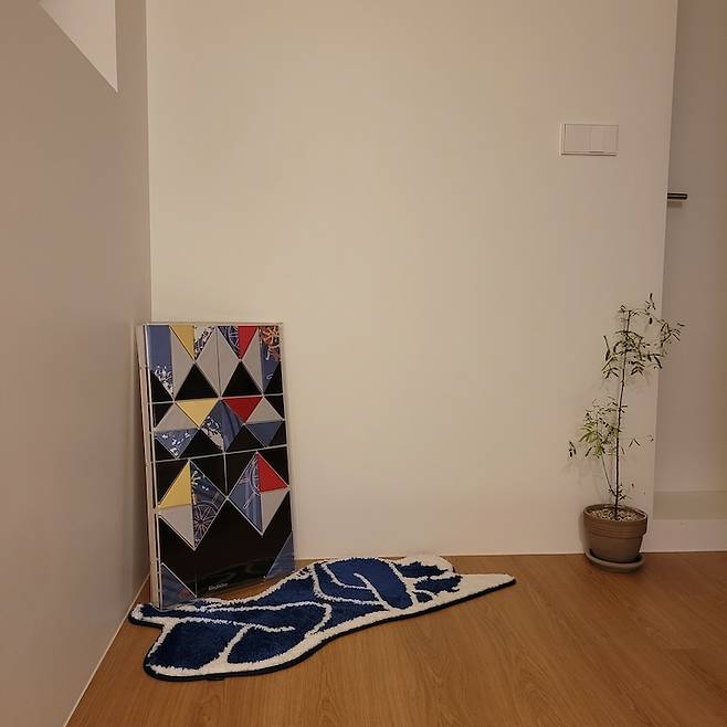 오픈된 듯한 원룸형의 2층 침실은 오붓하고 아늑한 무드를 주기 위해 러그를 깔았어요. 현재는 김작가님의 작품을 받쳐주는 받침대로서의 역할을 톡톡히 하고 있습니다.