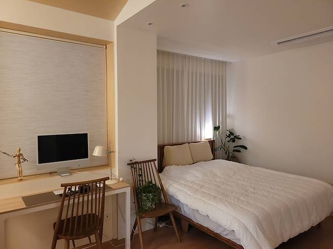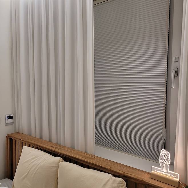 침대 위에 위치한 창은 동일한 허니콤 블라인드이지만, 숙면을 위해 암막 블라인드로 설치했어요. 평소에는 촤르르 커튼 사이의 아침 볕에 일찍 일어나지만, 주말 늦잠에 암막은 필수더라구요:)