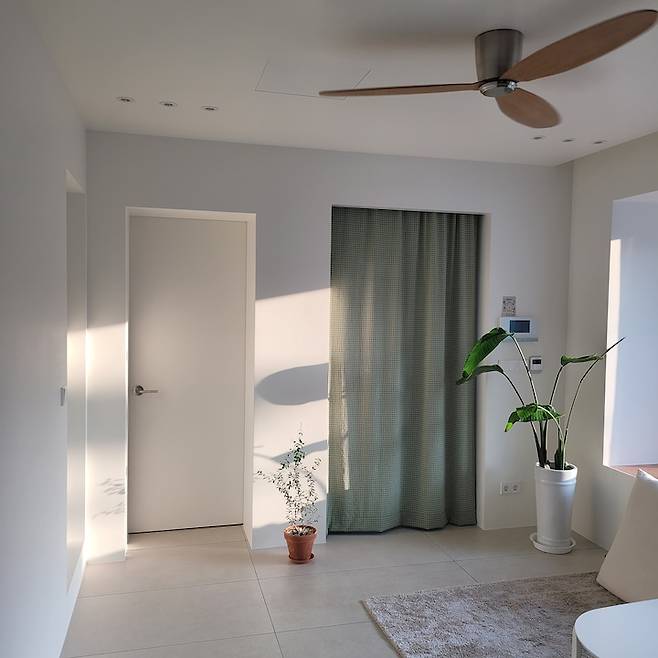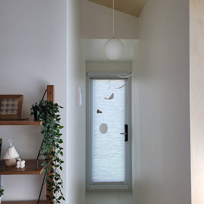 2층 현관문에는 베이지색 허니콤블라인드로 조금 다르게 포인트를 주었어요. 햇살이 들어오니 하얗게 보이네요.