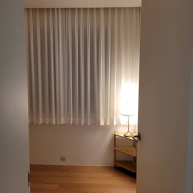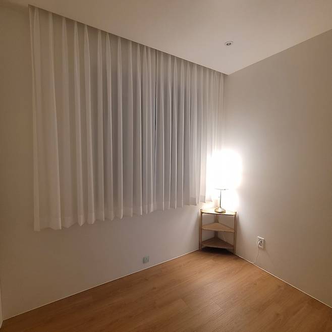 드레스룸이기 때문에 제일 먼저 커튼을 달았어요. 시스템 창호에 주로 설치하는 허니콤 블라인드와 커튼 사이에서 고민을 했던 것 같아요. 하지만, 카페 같은 느낌의 1층 분위기를 위해 모든 창은 촤르르 커튼이라 불리는 쉬폰 커튼으로 통일하여 달았습니다.