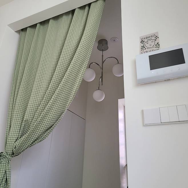 단열에 약하다고 소문난 단독주택이지만, 저희는 중문을 설치하지 않았어요. 대신 패브릭을 좋아하는 저의 취향에 따라 계절별, 무드별 커튼을 달아 분위기를 바꿔줍니다.