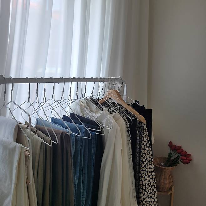 올해 6월 경 작은 방 수납의 방법과 구조를 바꿔 보았어요. 계절 지난 옷은 붙박이장에 넣어 보관하고, 현 계절 옷은 행거에 걸어 붙박이장 앞에 배치하였어요. 붙박이장을 벽처럼 이용하면 다른 벽 공간을 확보해 훨씬 넓게 사용할 수 있었는데 늦게 깨달았지 뭐예요:)