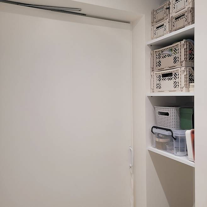 세탁실 문은 앞서 이야기한 것처럼 히든도어로 설치하였어요. 문의 오른쪽 빈 공간에는 칸을 나누어 선반을 설치하였습니다. 아래 칸에는 무선 청소기와 제습기를 보관하고, 위 칸에는 로봇청소기, 물걸레, 자주 사용하는 공구와 각종 소모품들을 바구니에 나누어 정리하였습니다.