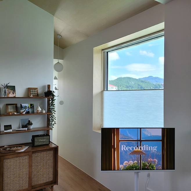 동네 주변이 산으로 둘러싸여 있어 날씨가 좋은 날에는 창 너머로 그림 같은 뷰가 펼쳐집니다. 이 창 너머의 뷰를 온전히 감상하고자 창호의 형태를 통창으로 선택하였어요.
