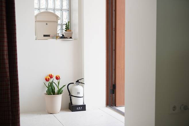 봄날엔 종종 이렇게 현관문을 열어두었어요. 무교이지만 동네 교회에서 전도하며 주신 튤립 세송이를 보며 행복했었네요. 유리블록이 현관 채광 덕분에 더 반짝이던 때입니다. 요즘과 같은 여름엔 벌레가 많아 열어 놓지 못해요^.ㅠ