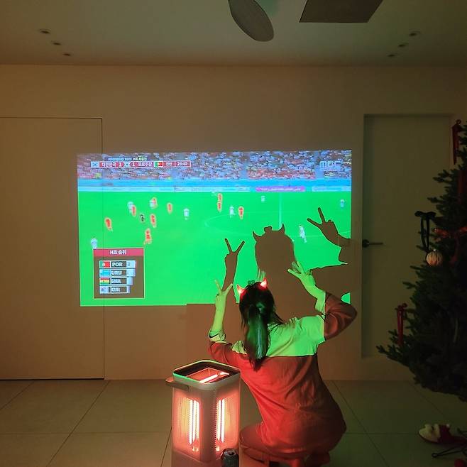 소파를 포기하며 얻은 거실 한 면의 하얀 벽. 덕분에 넓은 화면으로 어떠한 영상이든 생동감 있게 감상할 수 있습니다. 지난 월드컵 때 집에서 친구와 월드컵 경기도 함께 보면서 열심히 응원도 했었네요:)