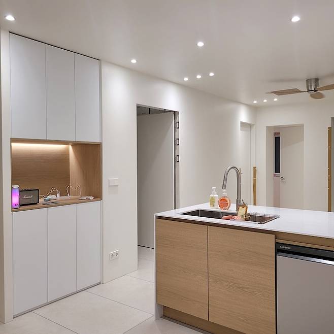거실의 한 쪽 면에 위치한 세탁실 및 팬트리 문은 히든 도어로 설치했어요. 무문선의 히든도어 덕분에 깔끔한 벽을 만들어 낼 수 있었어요.