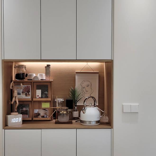 세탁실 옆 공간에는 카페장을 제작하였고 수납공간을 확보했어요. 카페장 하부에는 전자레인지와 커피포트, 1인용 인덕션과 에어프라이어가 위치해있고 상부에는 키친타올과 휴지, 각종 커피와 차, 핸드드립 도구들이 수납되어 있습니다.