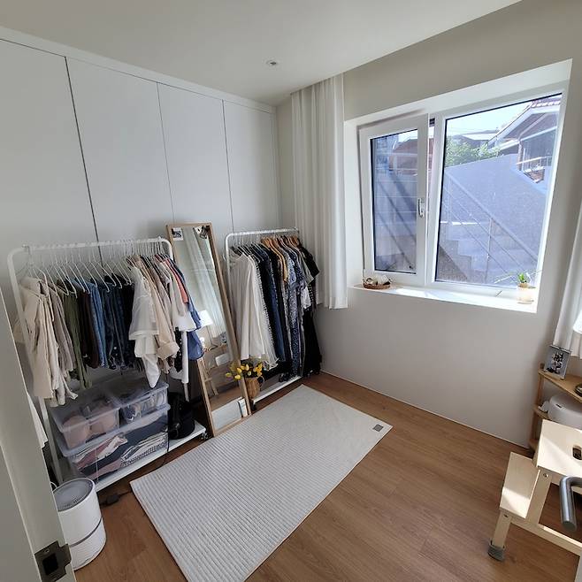 무엇보다 물걸레질을 할 수 있어 관리가 용이한 장점이 있어요. 또 하나, 작은 방에는 옷을 보관할 수 있도록 붙박이장을 설치했어요. 집의 층고(2600mm)가 높아, 다양한 옷을 많이 보관할 수 있지만, 옷을 꺼낼 때 작은 사다리 또는 옷가게용 막대가 필요해요.