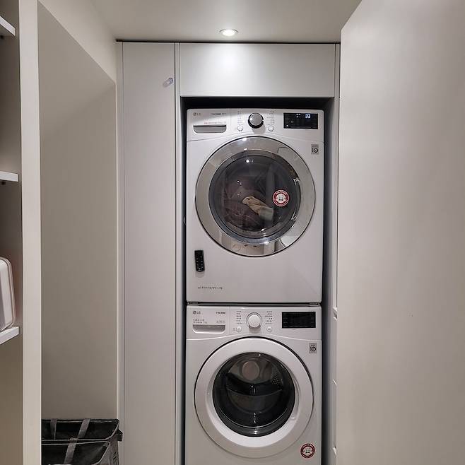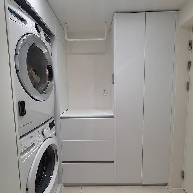 기존의 화장실 공간은 세탁실과 팬트리 공간이 되었습니다. 이전 집에서 사용했던 세탁기와 건조기를 그대로 가지고 왔고, 공간에 맞춰 붙박이장을 시공하였습니다.