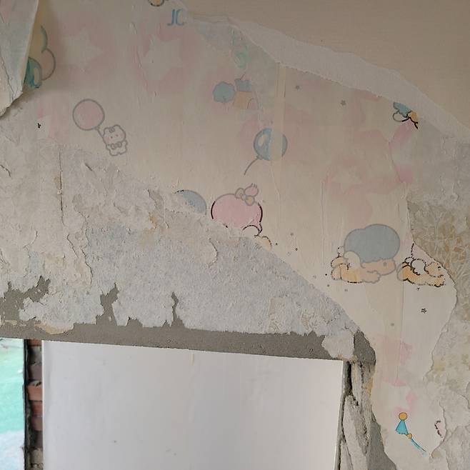 2층 방에서 발견한 30여년의 덧방시공 흔적. 벗겨내면서 만난 그 시절의 인기 벽지가 무척 반가웠어요:) 2층에는 화장실 하나와 원룸형 침실로 공간을 구성하였어요. 평소에는 부부의 공간이나, 손님이 놀러 오거나 어른들이 오시면 이 공간을 내어드립니다.