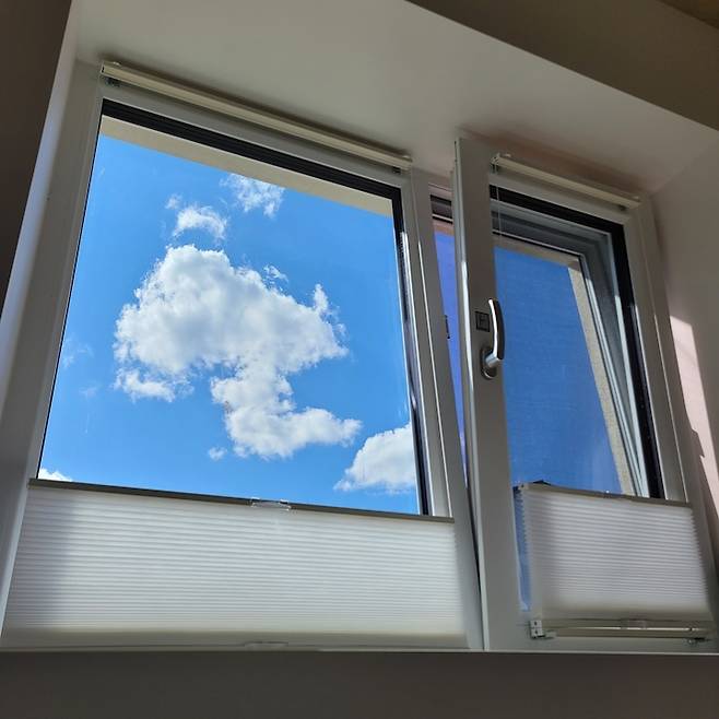 앞이 뻥 뚫린 2층 창문. 이 창을 통해 오늘의 날씨를 확인합니다. 2층의 창들은 모두 허니콤 블라인드로 달았습니다. 가리고 싶은 아래 부분은 쓱- 가리고 하늘은 볼 수 있어 매우 만족스럽습니다.