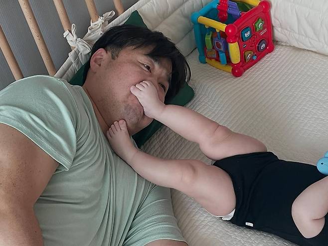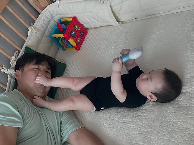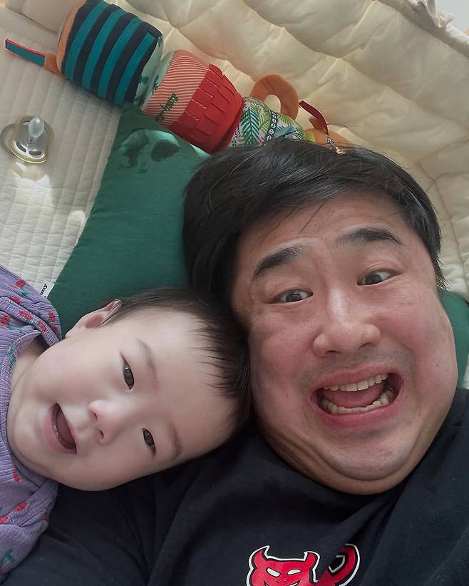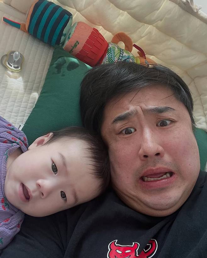 사진 속 강재준은 특유의 코믹한 표정을 짓고 있고, 옆에 누운 아기 현조는 아빠를 따라 하듯 혀를 내밀거나, 함께 눈을 크게 뜨며 미묘하게 싱크로율 높은 표정을 짓고 있어 웃음을 자아낸다. 누가 먼저 장난을 시작했는지는 모르겠지만, 두 사람 사이의 텐션은 이미 높은 수준이 아닐까.